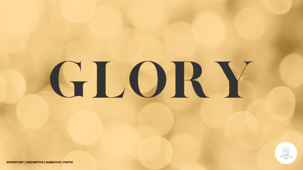 Glory. What is glory? Take a few minutes to reflect. It’s OK to use a dictionary or to Google the meaning. How does glory look? Sound? Smell? Taste? Feel? How do you know when you achieve glory? What items would be on the checklist? Does glory come from within, or does another’s attention or praise bring glory? Is it a conscious goal or a byproduct? Share briefly an encounter you’ve had with glory.