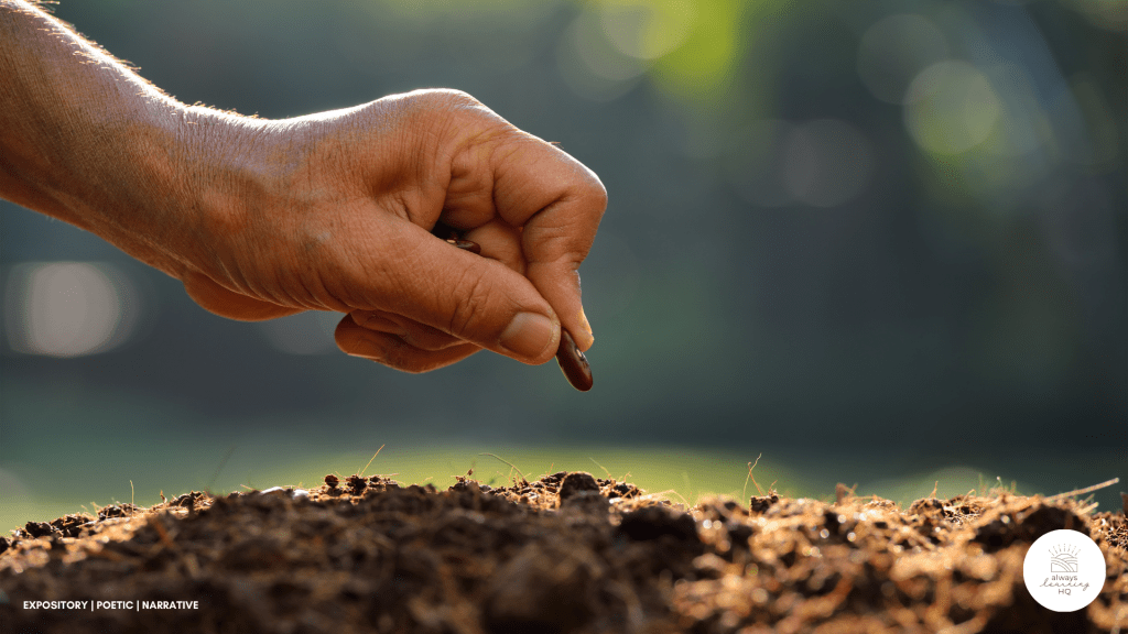 Write a narrative poem that tells the story of planting the seed and nurturing it. Conclude with a description of the harvest.
